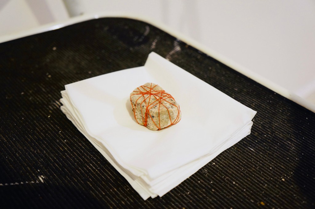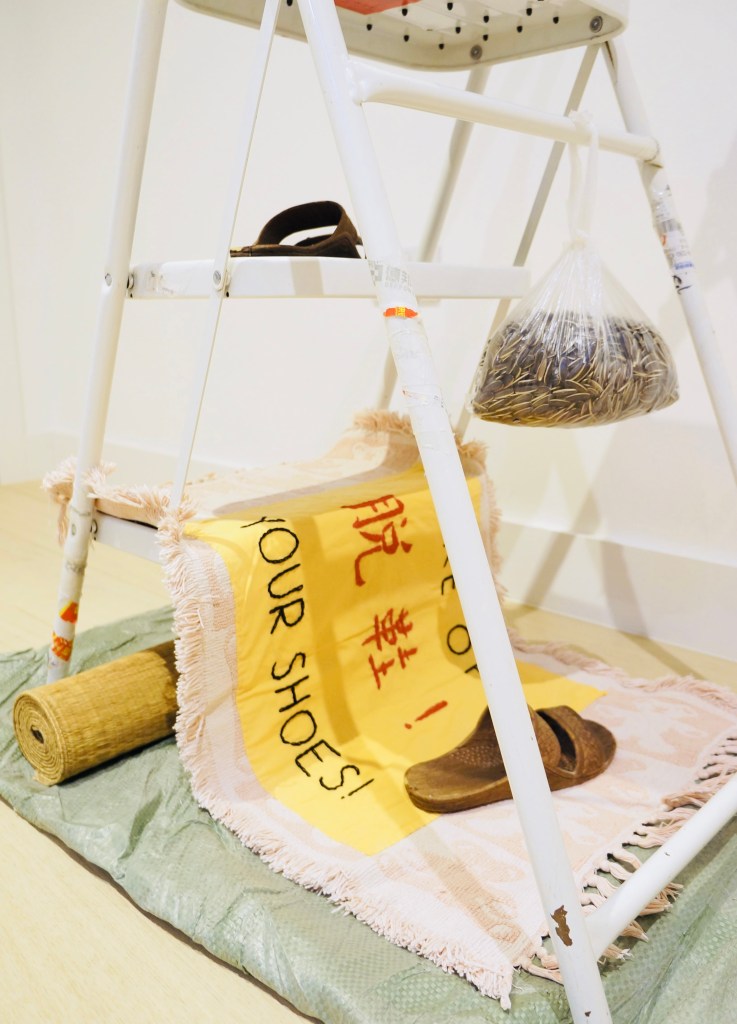 Materials: step ladder, packaging, straw mat, textiles, sandals, sunflower seeds, tissue, stone, thread, stationery, matches